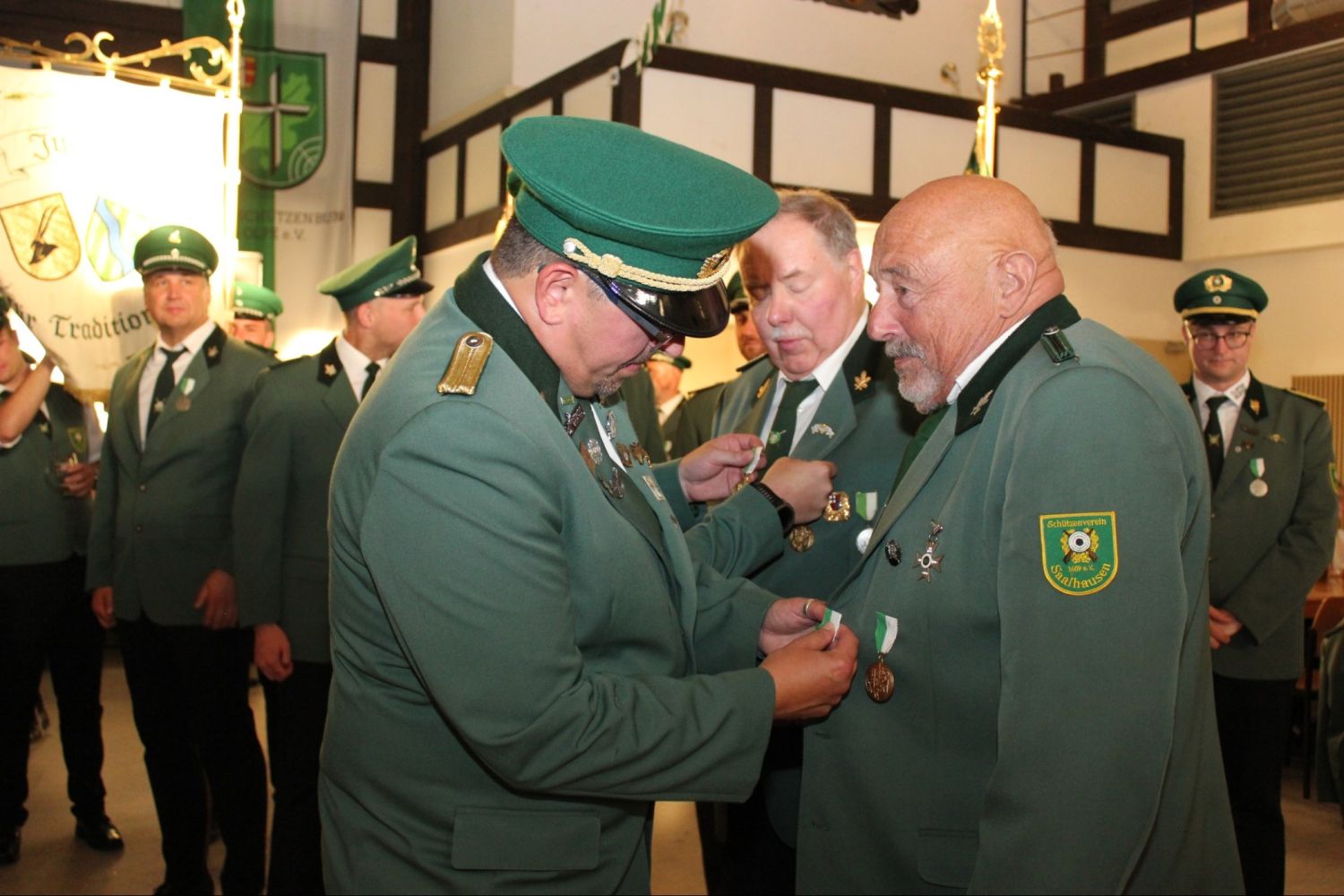 Mit dem Saalhauser Verdienstorden, einem Orden, der an diejenigen verliehen wird, die mit Ihrem Engagement den Schützenverein mit Leib und Seele über viele Jahre unterstützt haben. Ausgezeichnet mit diesem Orden wurden unser Herold Martin Hein und unser langjähriges Offizierskorps-Mitglied Josef Frese.