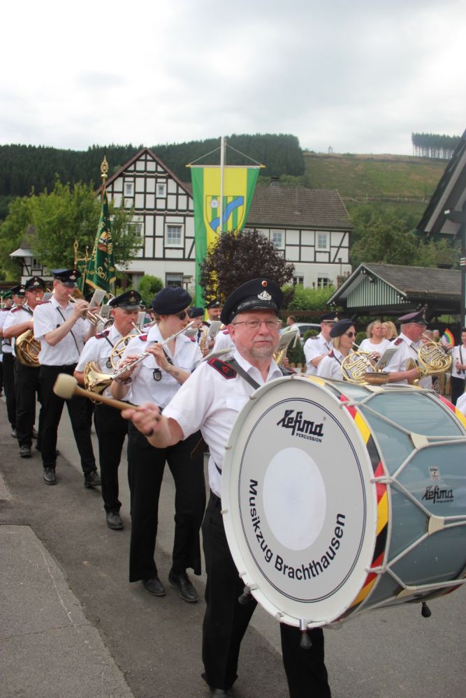 Das Fest begann am Freitagabend mit dem Antreten in der Schützenhalle und dem feierlichen Ausmarsch zur Schützenmesse in der St.-Jodokus-Kirche um 18:00 Uhr. Pastor Thomas Hengstebeck reiste wie schon in den vergangenen Jahren aus Rheda an, um zusammen mit Pastor Leber eine besondere Predigt zu halten. Danach ging es mit musikalischer Unterstützung des Musikvereins auBrachthausen zurück in die Halle.